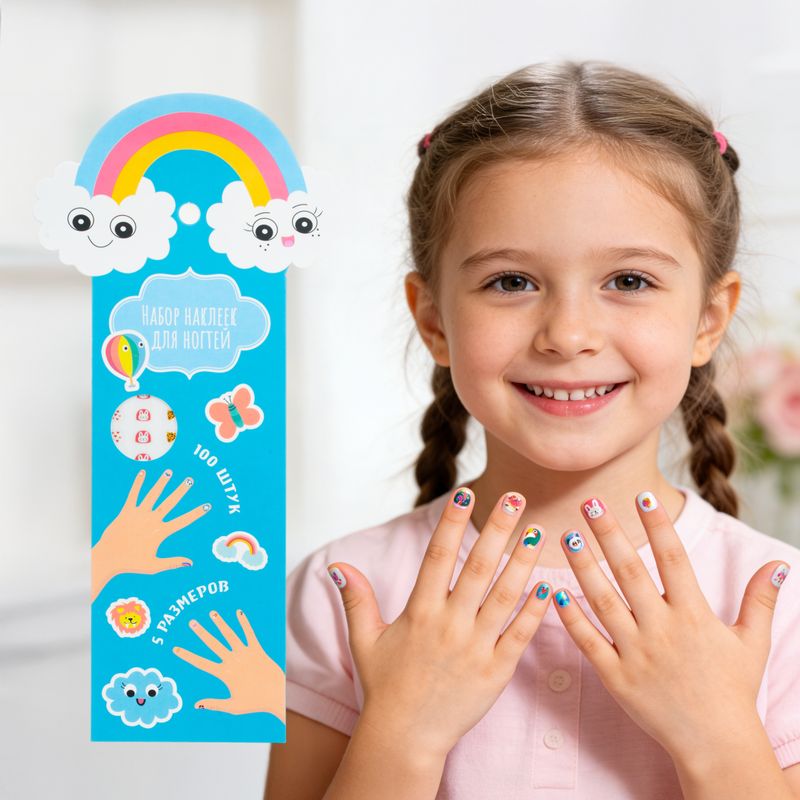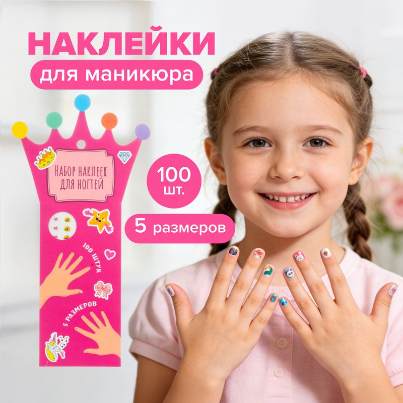 Наклейки для маникюра – чудесный выбор для маленькой модницы. В наборе 100 ярких наклеек в 5 размерах! Состав: эпоксидная смола, акрил, чернила, клеевой слой. Товар представлен в ассортименте.