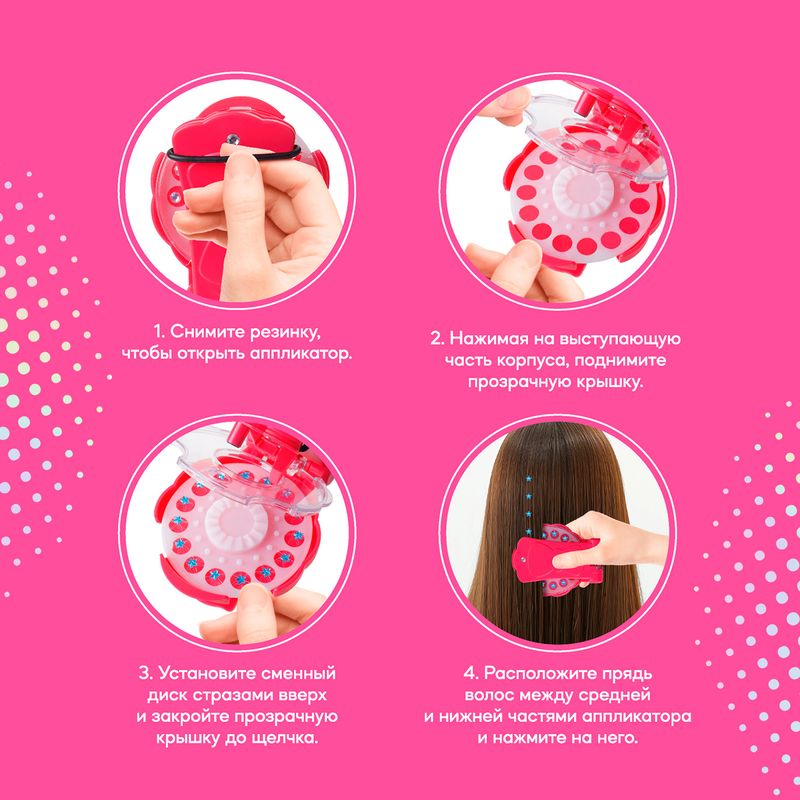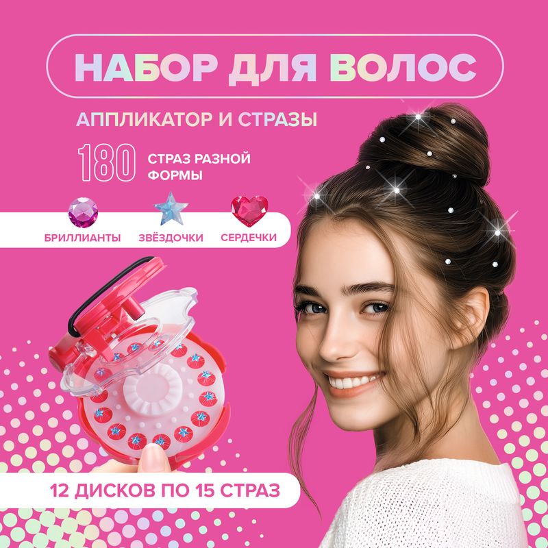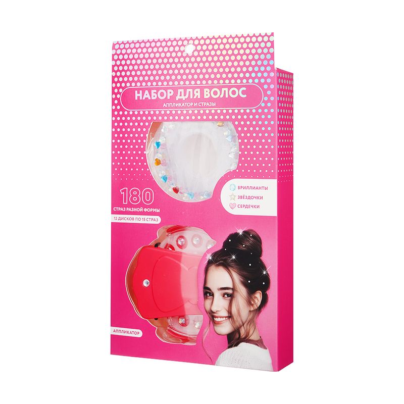 Набор для волос поможет создать яркую и стильную причёску! В комплекте аппликатор и 180 страз различной формы (12 дисков по 15 страз). Диаметр диска: 8 см. Подходит также для украшения одежды, аксессуаров, смартфона и обуви. Состав: АБС, ПС, ПОМ, ПВХ, сталь, силикон.