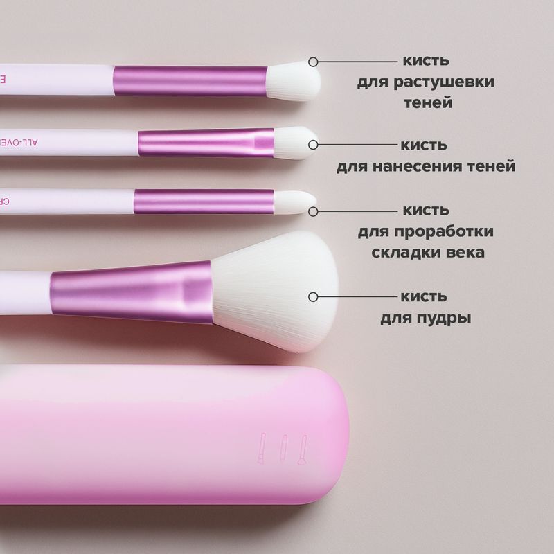 Набор кистей для макияжа, Lovely, включает в себя 4 кисти: для пудры, для растушёвки и нанесения теней, для проработки складки века. Набор помещается в лёгком и простом в уходе футляре. Размер: кисти – 15/16 см; футляр – 19х5 см. Состав: кисти – дерево, алюминий, нейлон; футляр – силикон.