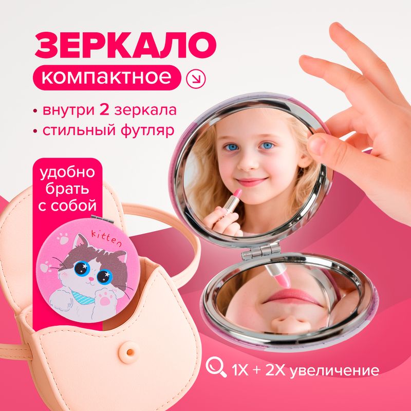 Зеркало компактное, Lovely, в стильном футляре легко поместится в сумочку или косметичку. Внутри 2 зеркала – стандартное и с двукратным увеличением. Удобно брать с собой в поездки или на прогулку. Размер: 7х7 см. Состав: ПУ, стекло, АБС, сталь, смола. Товар представлен в ассортименте.