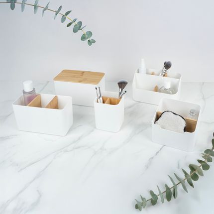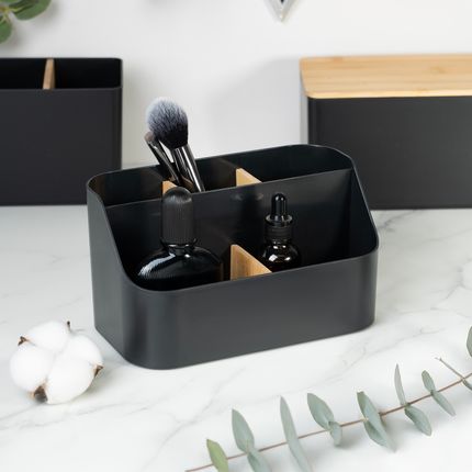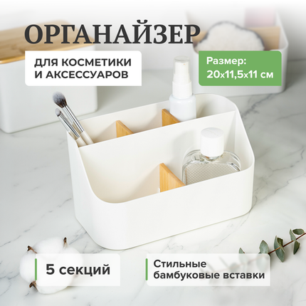 Арт. 5933013Органайзер для косметики и аксессуаров, Lovely, с 5 секциями позволит удобно рассортировать косметику, кисти и аксессуары. Со стильными бамбуковыми вставками. Размер: 20×11,5×11 см. Состав: ПП, бамбук. Товар представлен в ассортименте. Вы также можете приобрести другие органайзеры для косметики и аксессуаров в похожем дизайне: для кистей (ЛК: 5933011), с 3 секциями (ЛК: 5933012), с 2 секциями (ЛК: 5933014), с крышкой (ЛК: 5933071).
