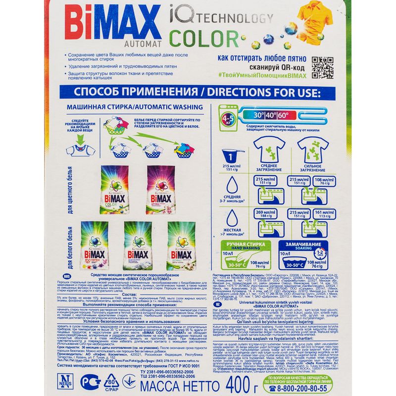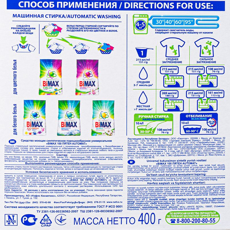 Стиральный порошок, BiMax, отлично подойдет для ручной и машинной стирки. Прекрасно удаляет пятна. Перед использованием ознакомьтесь с инструкцией и мерами предосторожности на упаковке. Масса нетто: 400 г.