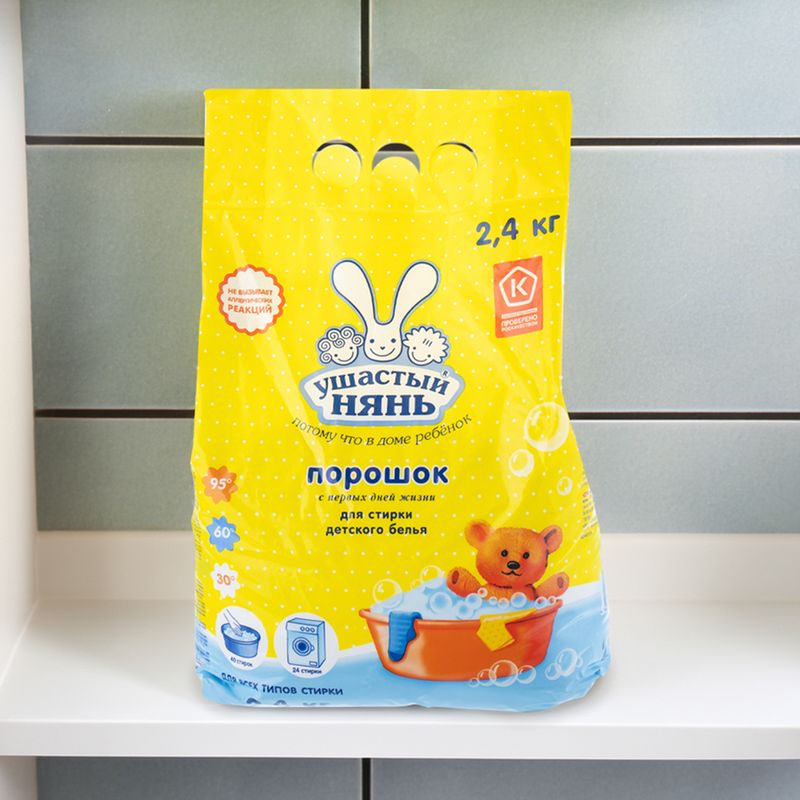 Стиральный порошок детский, Ушастый нянь, создан специально для детской одежды. Подходит для ручной и машинной стирки. Не вызывает аллергических реакций. Перед применением ознакомьтесь с инструкцией и мерами предосторожности на упаковке. Масса нетто: 2,4 кг.