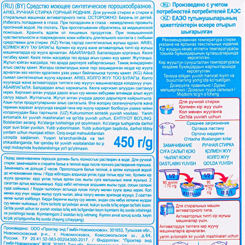 Стиральный порошок "Ручная стирка", Ariel, отлично удаляет пятна с первой стирки! Обладает свежим ароматом. Подходит для стирки смешанных тканей (кроме шерсти и шёлка). Перед использованием ознакомьтесь с инструкцией и мерами предосторожности на упаковке. Масса нетто: 450 г.