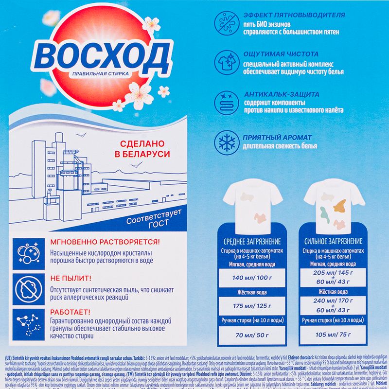 Стиральный порошок "Восход" для цветного белья эффективно удаляет пятна, дарит вещам чистоту и приятный аромат. Содержит элементы против накипи и известкового налёта. Подходит для автоматической и ручной стирки. Мгновенно растворяется, не пылит. Перед использованием ознакомьтесь с инструкцией и мерами предосторожности на упаковке. Масса нетто: 400 г.