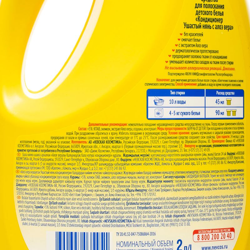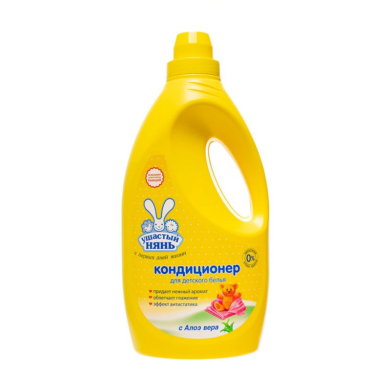 Кондиционер детский, Ушастый нянь, придаёт детскому белью нежный аромат, облегчает глажку и обладает эффектом антистатика. С алоэ вера. Не вызывает аллергических реакций. Не содержит красителей, хлора, щелочи. Перед использованием ознакомьтесь с инструкцией и мерами предосторожности на упаковке. Объём: 2 л.