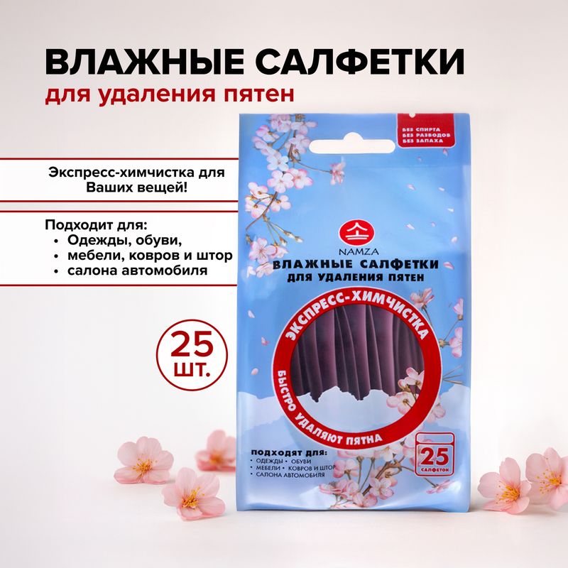 Влажные салфетки для удаления пятен, NAMZA – это экспресс-химчистка для Ваших вещей! Подходят для одежды, обуви, мебели, ковров, штор и салона автомобиля. В упаковке 25 салфеток. Перед использованием ознакомьтесь с инструкцией и мерами предосторожности на упаковке.