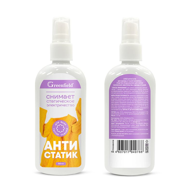 Спрей-антистатик, Greenfield, предназначено для снятия статического электричества с одежды и тканей. Подходят для всех типов тканей. Перед использованием ознакомьтесь с инструкцией и мерами предосторожности на упаковке. Объём: 125 мл.