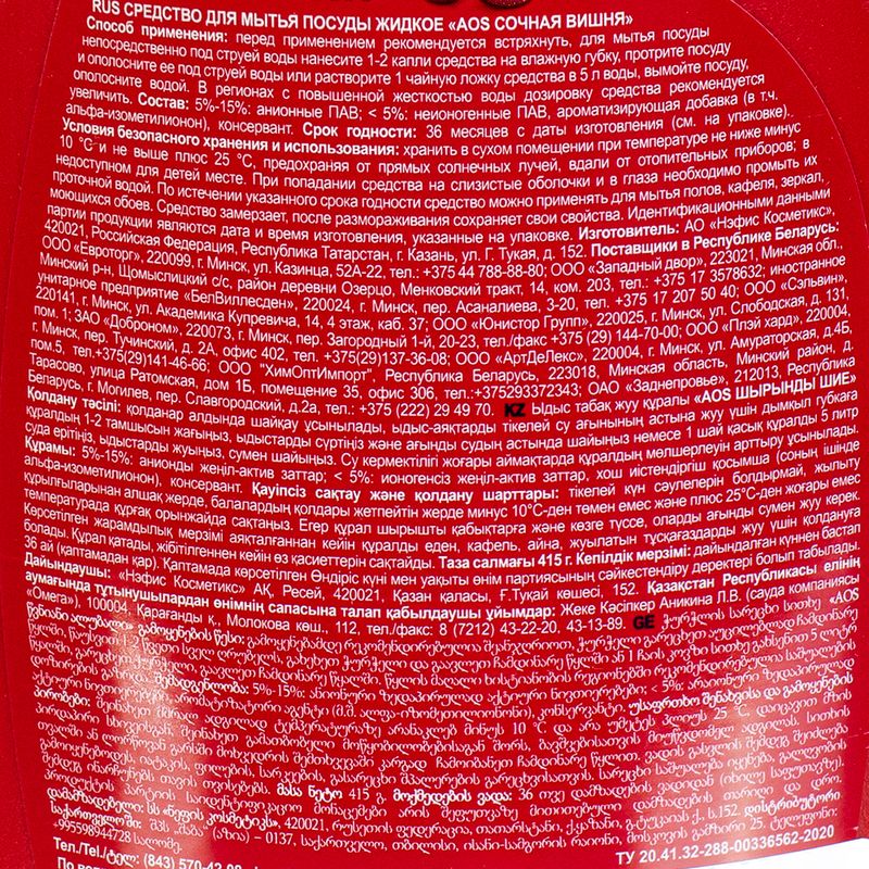 Средство для мытья посуды, AOS, отлично удаляет загрязнения и легко смывается водой. Масса нетто: 415 г. Товар представлен в ассортименте.