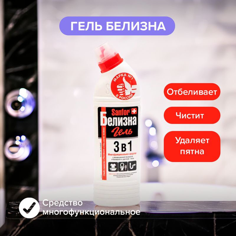 Чистящее средство "Белизна гель", Sanfor – это Ваш помощник в решении многих хозяйственных задач. Подходит для отбеливания белья перед стиркой. Применяется для дезинфекции сантехники и чистки труб. Эффективен при мытье унитазов и раковин. Удаляет известковый налёт, легко очищает от жировых пятен и мыльных потёков. Перед использованием ознакомьтесь с инструкцией и мерами предосторожности на упаковке. Масса нетто: 450 г.