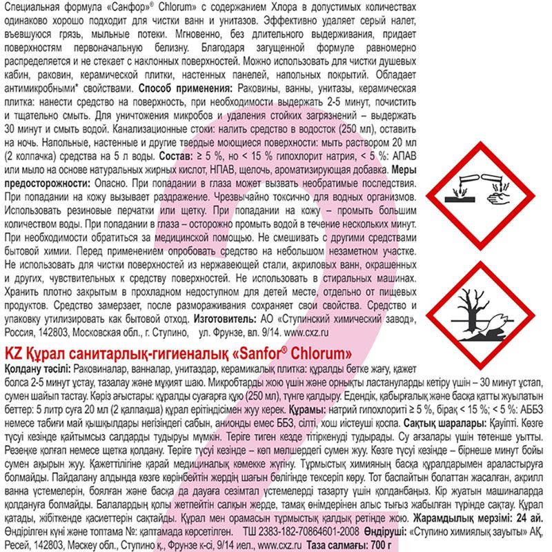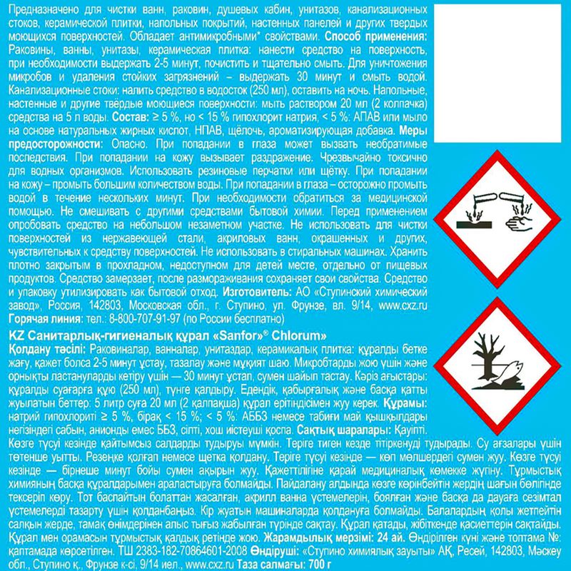 Чистящее средство, Sanfor, с хлором отлично подходит для чистки унитазов, ванн и раковин. Эффективно удаляет серый налёт, въевшуюся грязь, мыльные потёки. Возвращает поверхностям первоначальную белизну. Обладает антимикробными свойствами. Перед использованием ознакомьтесь со способом применения и мерами предосторожности на упаковке. Масса нетто: 700 г. Товар представлен в ассортименте.