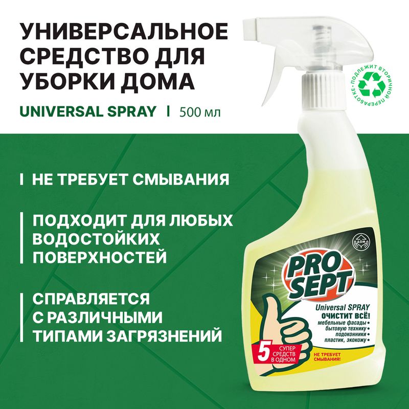 Средство чистящее универсальное "Universal Spray", PROSEPT – Ваш многофункциональный помощник в уборке! Очищает водостойкие поверхности от жира, грязи, пыли, косметики, следов клейкой ленты и копоти. Удаляет следы фломастеров, шариковой ручки, пятна йода. Отбеливает пластик и обладает эффектом защитного экрана против пыли. Не требует смывания водой. Перед использованием ознакомьтесь с инструкцией и мерами предосторожности на упаковке. Объём: 500 мл.