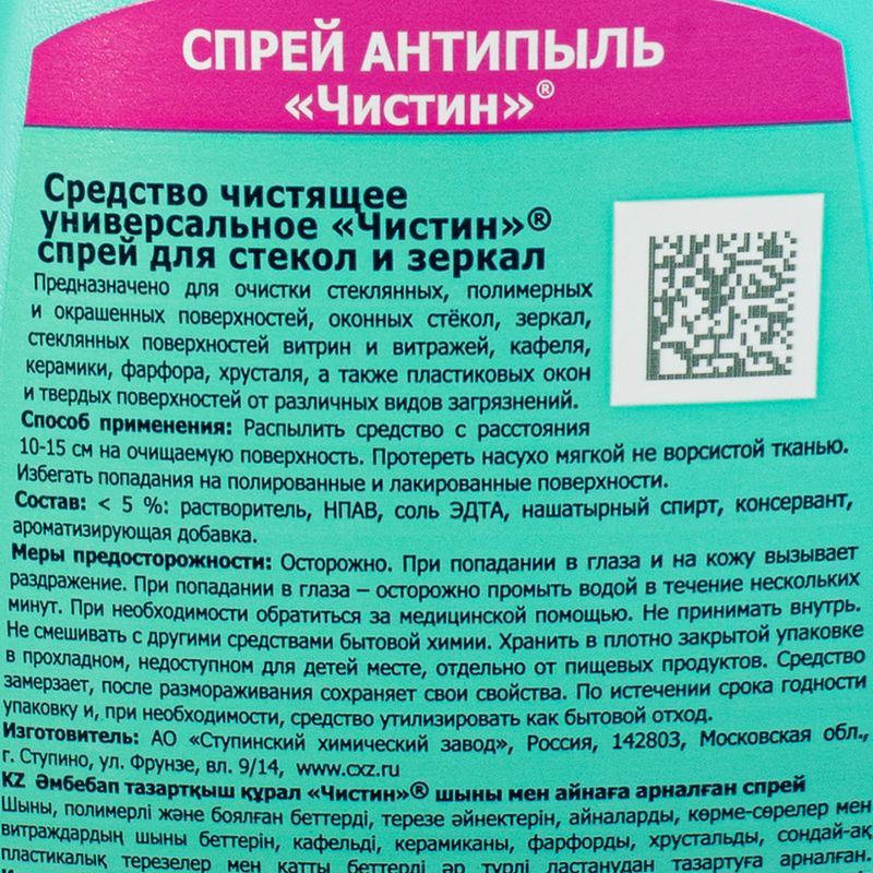 Средство чистящее "АНТИПЫЛЬ", Чистин, отлично подходит для стёкол и зеркал, а также пластика и керамики. Не оставляет разводов. Перед использованием ознакомьтесь с инструкцией и мерами предосторожности на упаковке. Объём: 500 мл.