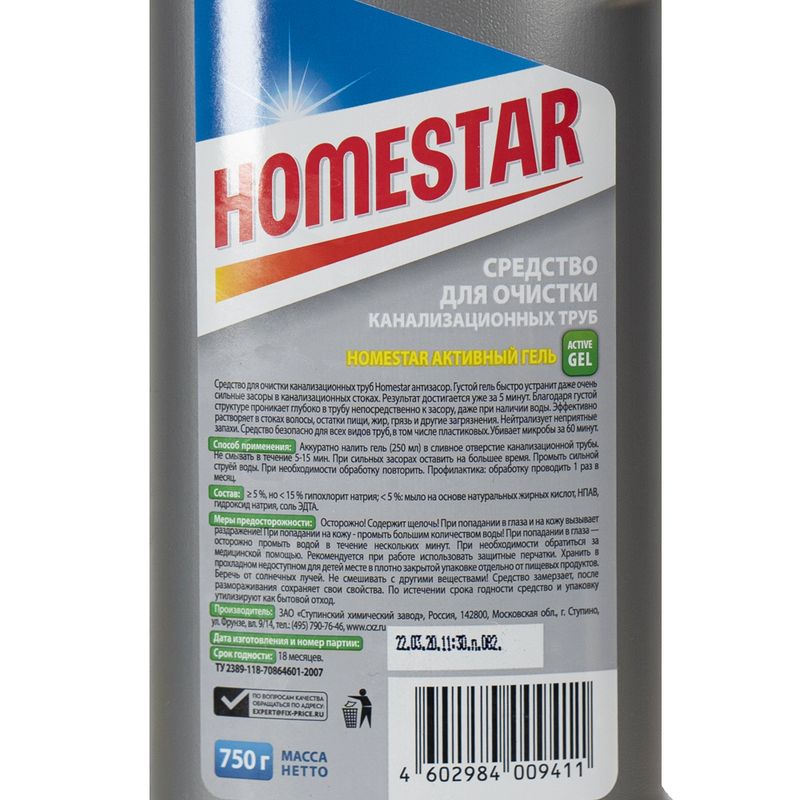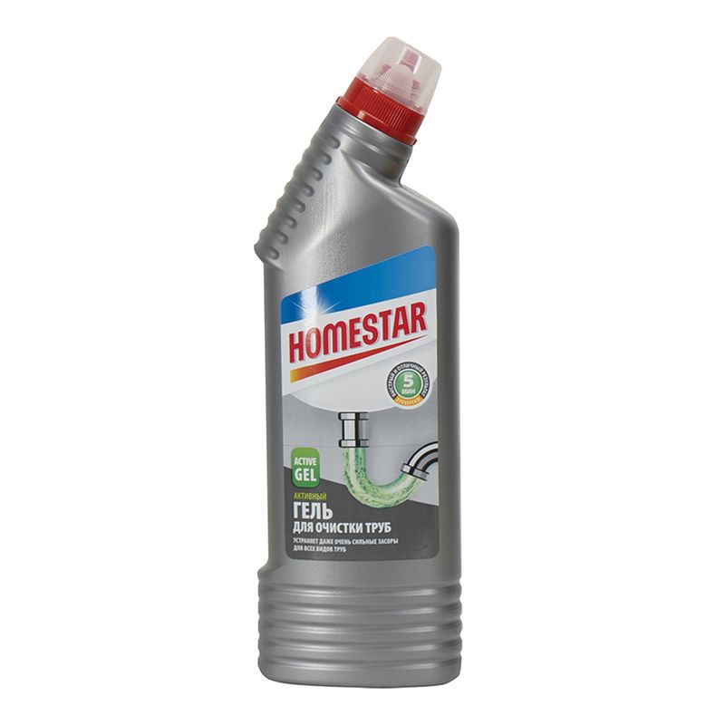 Гель для очистки труб, HOMESTAR, устраняет даже очень сильные засоры в канализационных стоках. Благодаря своей консистенции он проникает глубоко в трубу непосредственно к засору и эффективно растворяет волосы, остатки пищи, жир, грязь и другие загрязнения в течение 5 минут. Нейтрализует неприятные запахи. Средство безопасно для всех видов труб, в том числе пластиковых. Перед использованием ознакомьтесь с инструкцией и мерами предосторожности на упаковке. Объём: 750 мл.