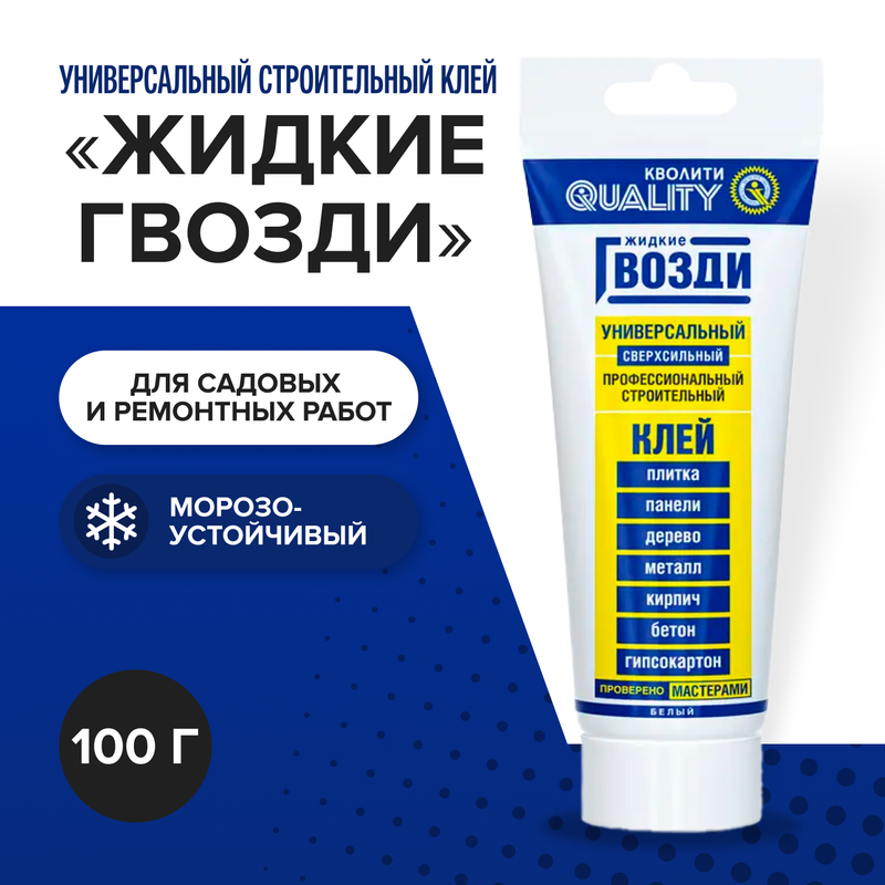 Профессиональный универсальный строительный клей "Жидкие гвозди", Кволити – это незаменимое средство для любого хозяйства. Морозоустойчивый сверхсильный клей поможет в садовых, дачных, ремонтных работах. Инструкция по применению и меры предосторожности указаны на упаковке. Объём: 100 г.