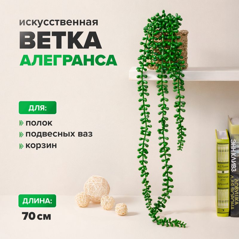 Искусственная ветка "Алегранса" отлично подойдёт для украшения или декорирования полок, подвесных ваз и корзин. Длина: 70 см. Состав: ПВХ, полиэтилен.