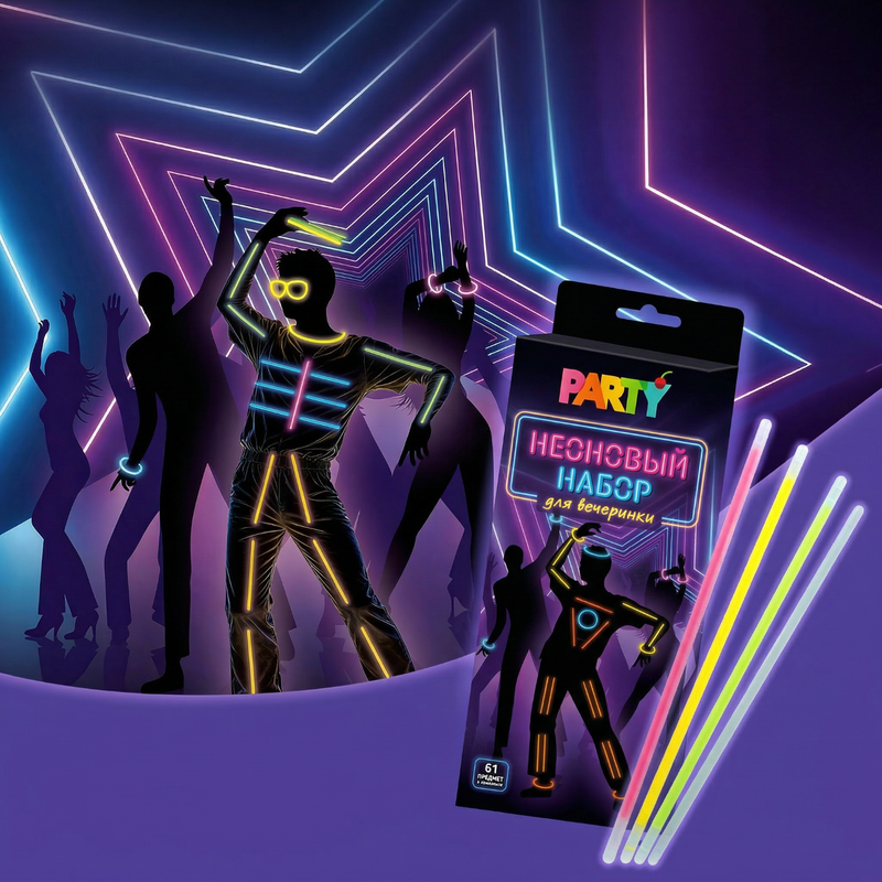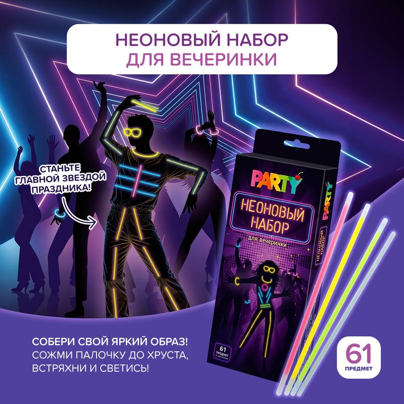 Неоновый набор для вечеринки, PARTY, сделает Ваш образ незабываемым! Набор включает в себя 24 светящиеся палочки (20 см), 28 стикеров и 9 соединителей. Станьте главной "зажигалкой" вечеринки! Время свечения: до 8 часов (2 часа в активном режиме). Перед использованием ознакомьтесь с инструкцией и мерами предосторожности на упаковке. Товар представлен в ассортименте.