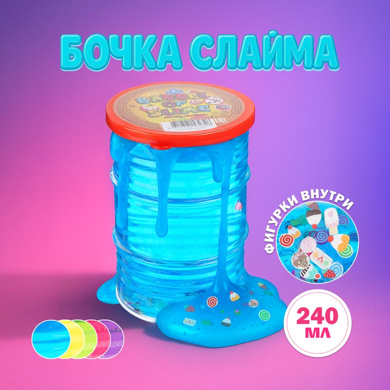 Бочка слайма надолго займёт внимание ребёнка! Мягкая тягучая масса очень приятна на ощупь. Игрушку хочется растягивать, сжимать и перебирать в руках! Внутри слайма находятся забавные фигурки. Для детей от 5 лет. Перед использованием ознакомьтесь с инструкцией мерами предосторожности на упаковке. Объём: 240 мл. Размер баночки: 9,5х6,5 см. Состав: вода, полимер, пластификатор, пищевой краситель, наполнитель, консервант, отдушка. Товар представлен в ассортименте.