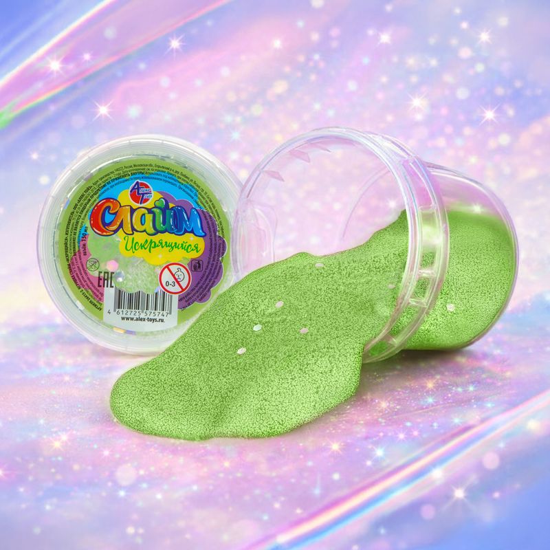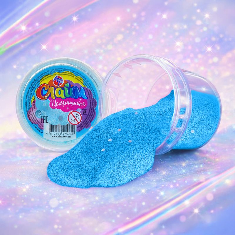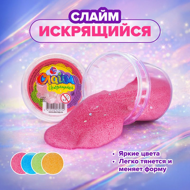 Слайм "Искрящийся" яркого цвета легко тянется и принимает разные формы. Отличный подарок для увлекательной игры и развития мелкой моторики рук. Для детей от 3 лет. Состав: вода, полимер, пластификатор, пищевой краситель, наполнитель, консервант, отдушка. Товар представлен в ассортименте.