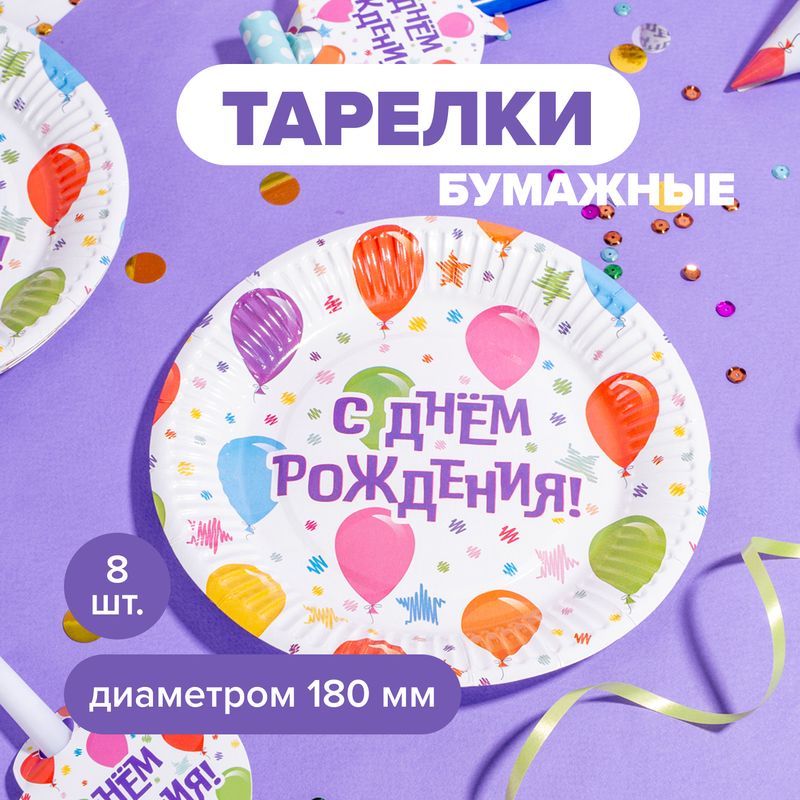 Тарелки бумажные праздничные, PARTY, 18 см, 8 шт., в ассортименте