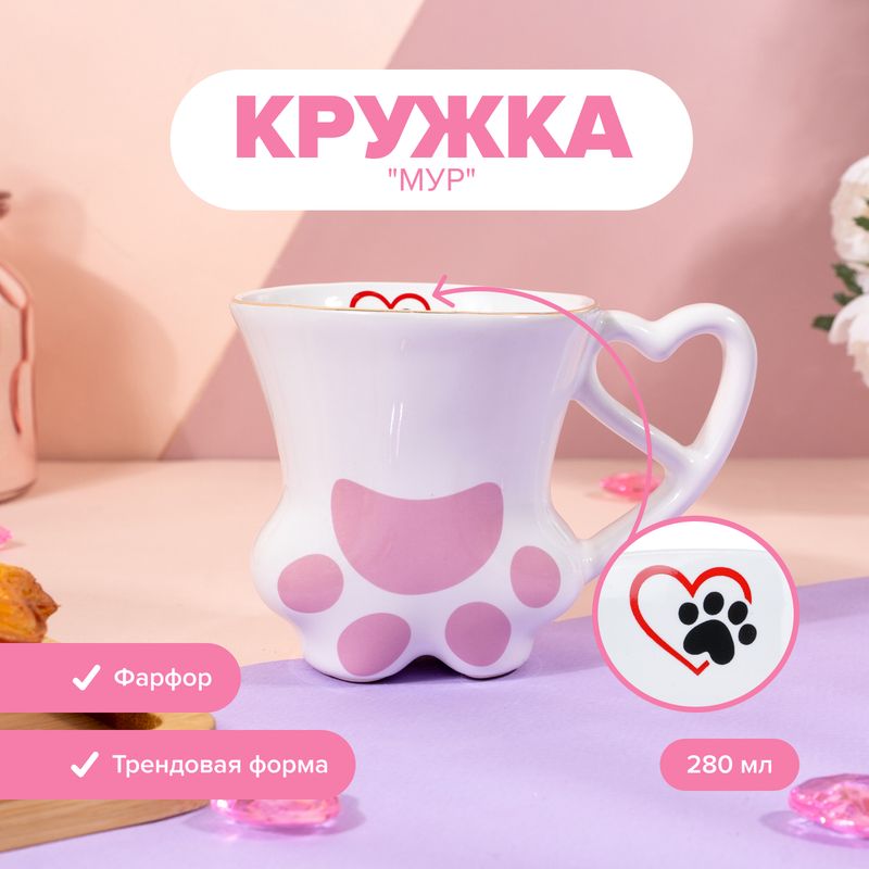 Кружка "Мур", With Love — это очаровательная чашка в форме кошачьей лапки, которая добавит нежности каждому утру и сделает чаепитие особенно уютными. Объём: 280 мл. Состав: фарфор. Товар представлен в ассортименте.