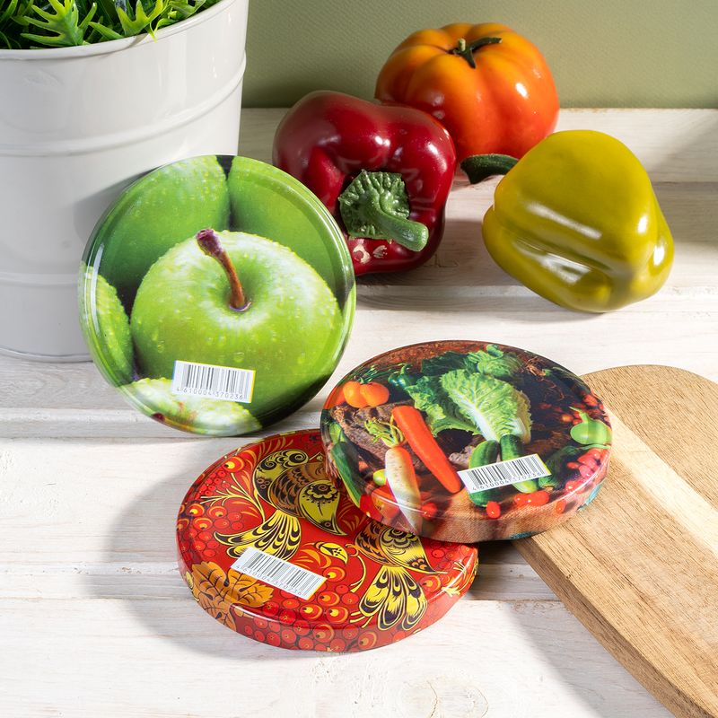 Крышка винтовая ТО-100 украшена ярким рисунком. Пригодится во время приготовления солений и варенья. Состав: жесть. Товар представлен в ассортименте.