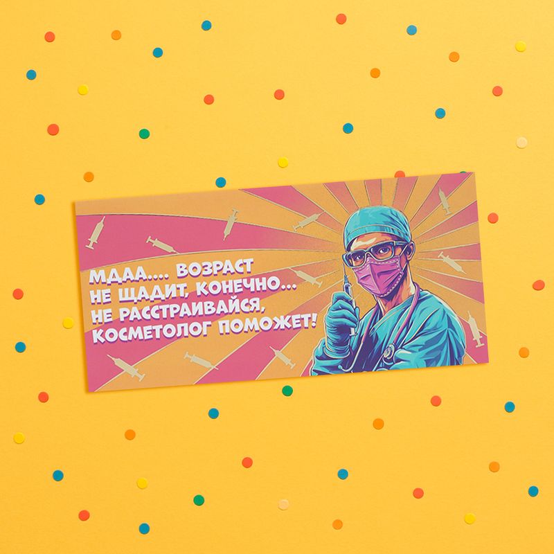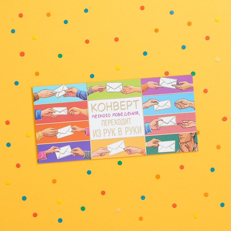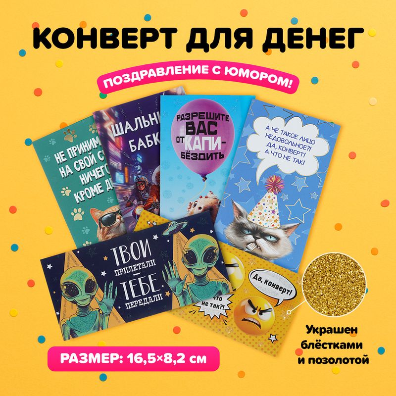Конверт для денег – отличный вариант для поздравления с юмором! Украшен блёстками и позолотой. Размер конверта: 16,5х8,2 см. Состав: картон, полиграфические краски, глиттерный лак. Товар представлен в ассортименте.