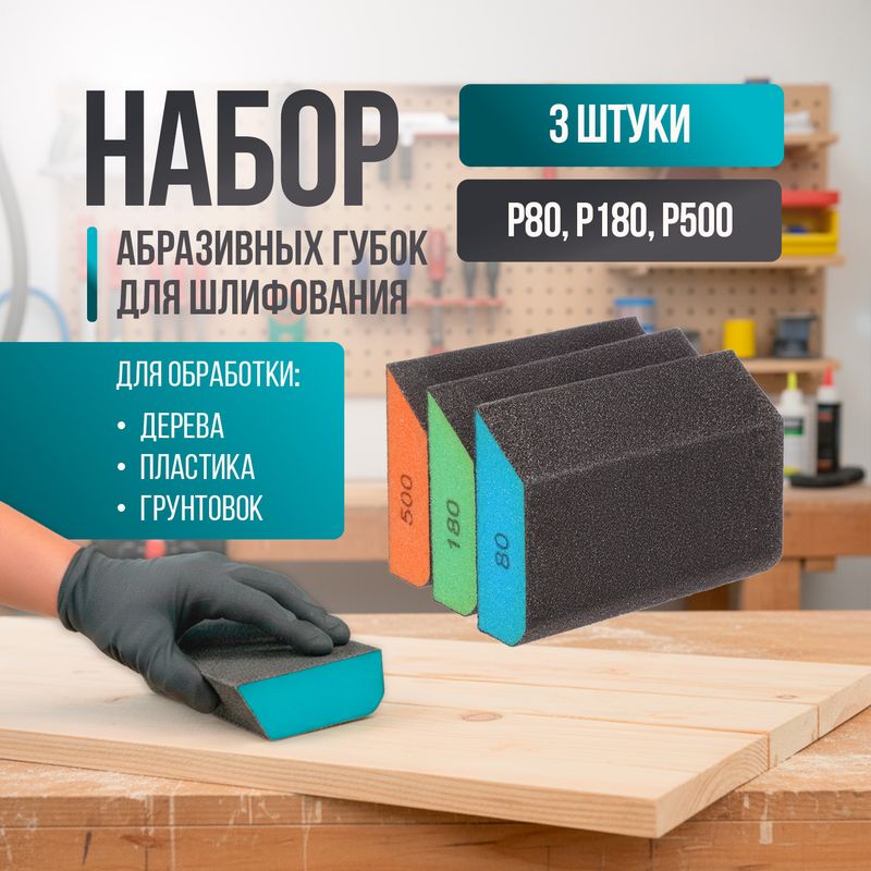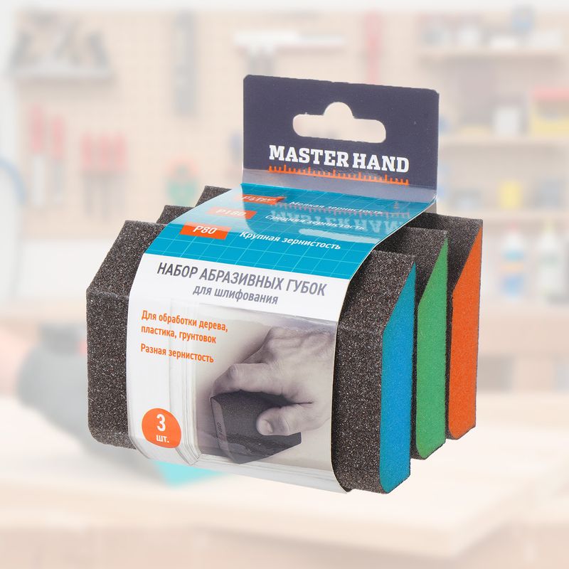 Набор абразивных губок для шлифования, Master Hand — практичное решение для работы с различными поверхностями. Подходят для зачистки, выравнивания и подготовки к покраске дерева, металла и пластика. Не крошатся при разрезании. В упаковке 3 губки разной зернистости: P500, P180, P80. Состав: вспененный полиуретан, оксид алюминия. Размер: 10х7х2,5 см.