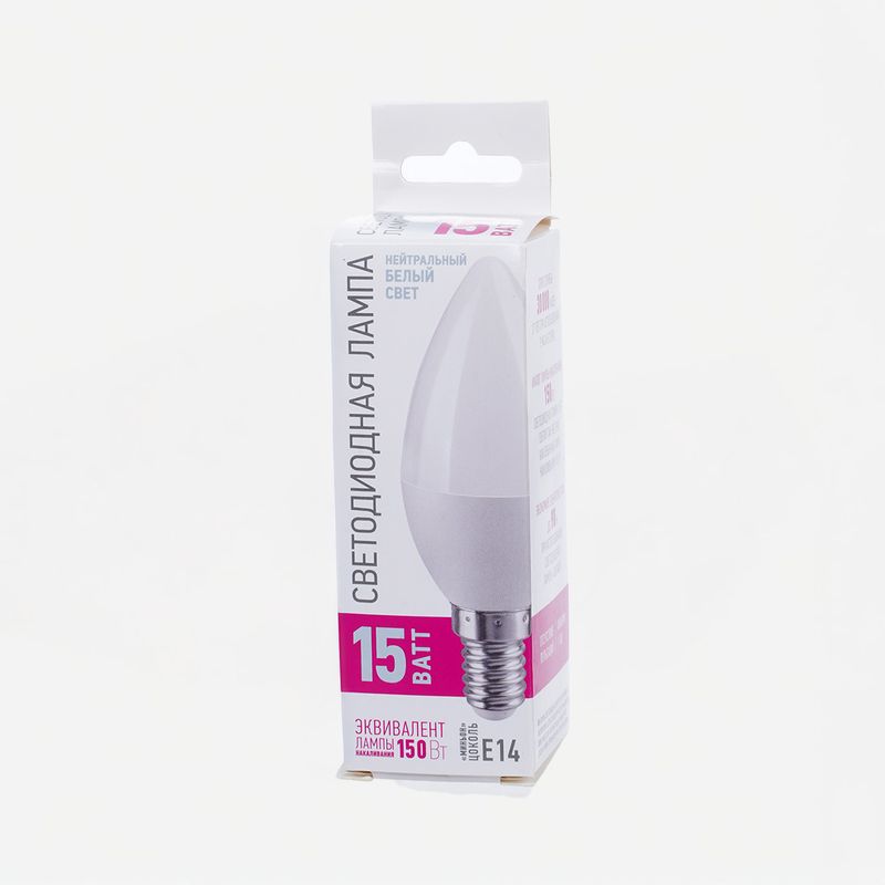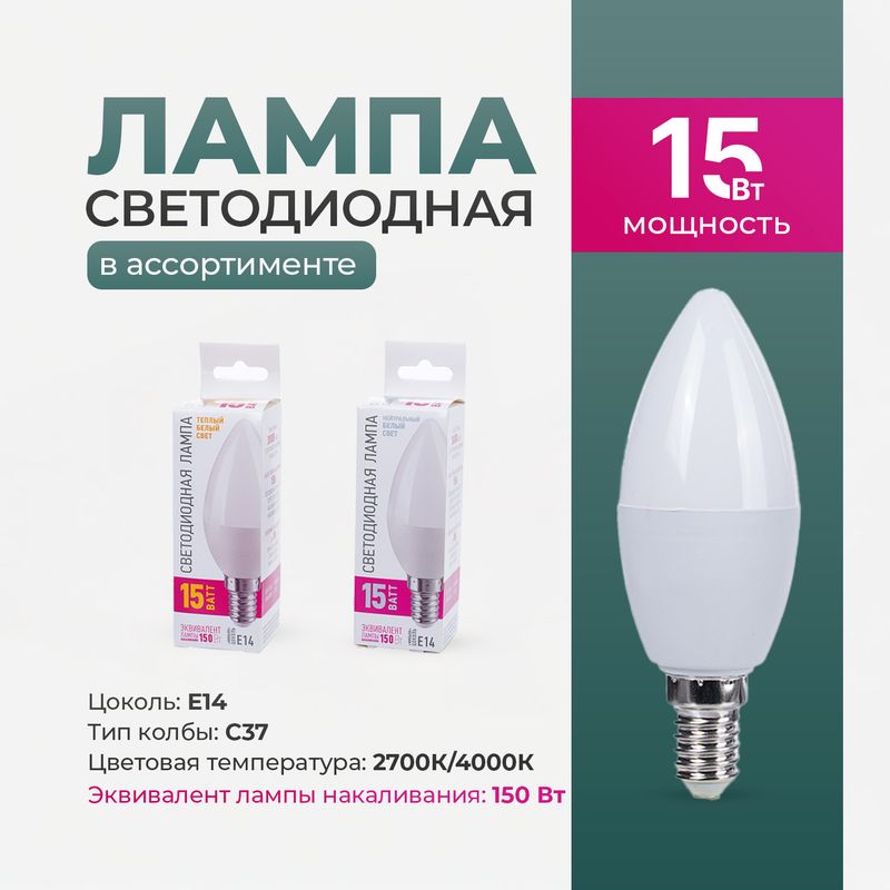 Лампа светодиодная, ОНЛАЙТ, подходит для осветительных приборов с цоколем Е14. В ассортименте лампы с тёплым белым светом и нейтральным белым светом. Перед применением ознакомьтесь с инструкцией и мерами предосторожности на упаковке. Время работы: до 30 000 часов. Тип колбы: С37. Мощность: 15 Вт (эквивалентна лампе накаливания мощностью 150 Вт). Световой поток: 1500 Лм. Цветовая температура: 2700К/4000 К.