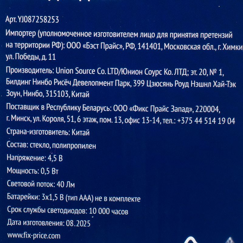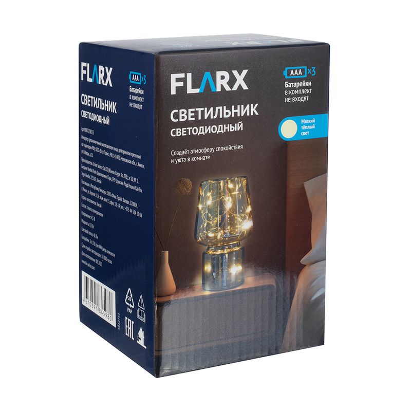 Светильник светодиодный, FLARX, с мягким тёплым светом поможет создать атмосферу спокойствия и уюта в комнате! Работает от 3 батареек типа ААА, в комплект не входят. Перед использованием ознакомьтесь с руководством по эксплуатации внутри упаковки. Напряжение: 4,5 В. Мощность: 0,5 Вт. Световой поток: 40 лм. Состав: стекло, полипропилен. Товар представлен в ассортименте.