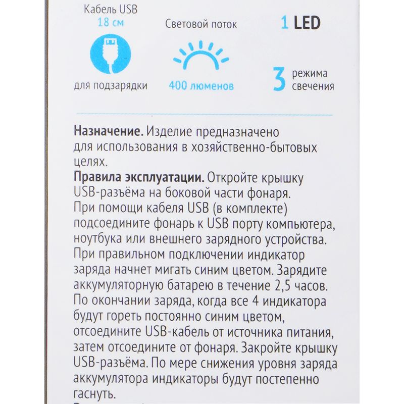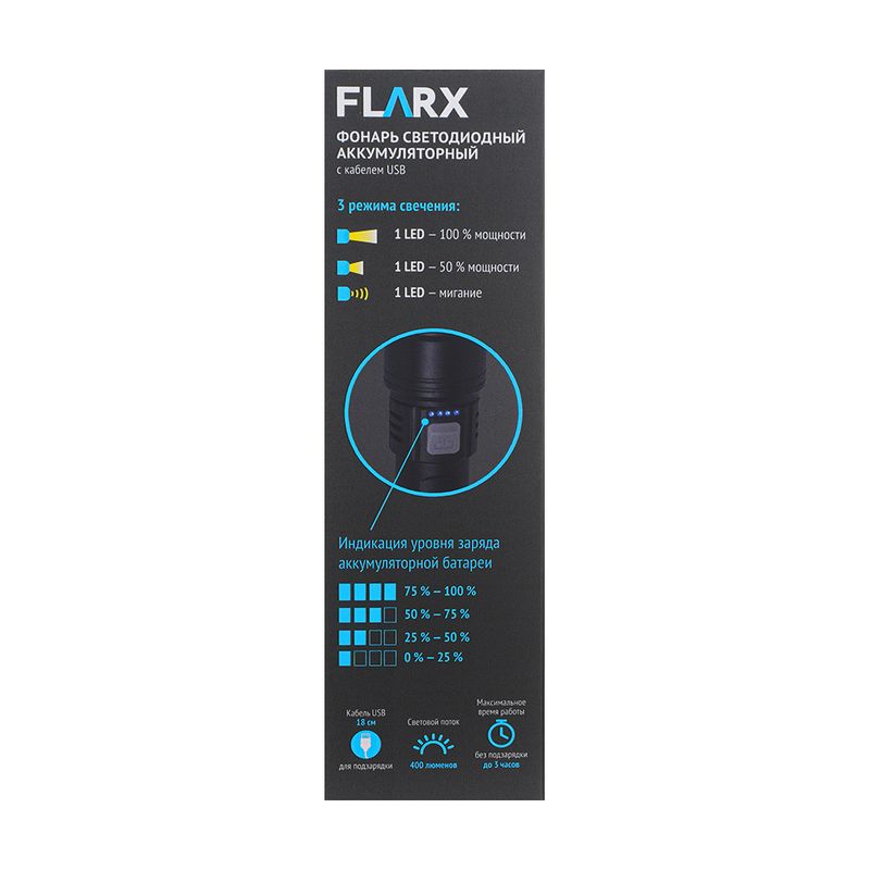 Фонарь светодиодный аккумуляторный с кабелем USB, FLARX — компактный, яркий и удобный для дома, прогулок и поездок. Аккумуляторная батарея обеспечивает работу без подзарядки до 3 часов, а зарядка через USB делает использование ещё проще. 3 режима свечения. С индикатором заряда. Перед использованием ознакомьтесь с инструкцией и мерами предосторожности на упаковке. Ёмкость аккумулятора: 800 мАч. Световой поток: 400 Лм. В комплекте кабель USB длиной 18 см. Состав: АБС, литий-ионная аккумуляторная батарея, сталь, нейлон, поликарбонат, силикон.