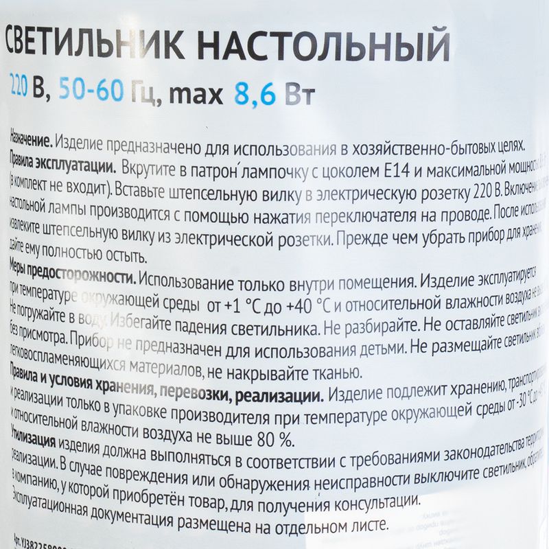 Светильник настольный, FLARX, в ретро-дизайне – прекрасный выбор для спальни или гостиной. Можно использовать в качестве ночника. Длина шнура: 100 см. Перед использованием ознакомьтесь с инструкцией и мерами предосторожности на упаковке. Напряжение: 220 В. Частота: 50-60 Гц. Максимальная мощность лампы: 8,6 Вт, в комплект не входит. Тип цоколя: Е14. Сила тока: 6 А. Состав: ПВХ, полиэтилен, АБС, сталь, медь. Товар представлен в ассортименте.