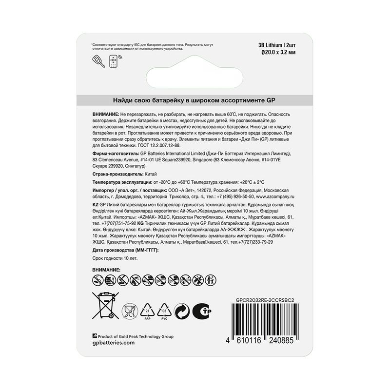 Батарейки литиевые CR2032, GR, предназначены для бытовой техники. В наборе 2 батарейки. Перед использованием ознакомьтесь с мерами предосторожности на упаковке.