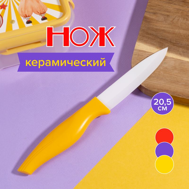Нож керамический, O’Kitchen, оформлен с яркой ручкой в жизнерадостных цветах. Подойдёт для аккуратной нарезки фруктов, овощей и сыра. Длина: 20,5 см. Состав: диоксид циркония, полипропилен. Товар представлен в ассортименте. Карнавал ярких красок в коллекции товаров для кухни "Цирк"!