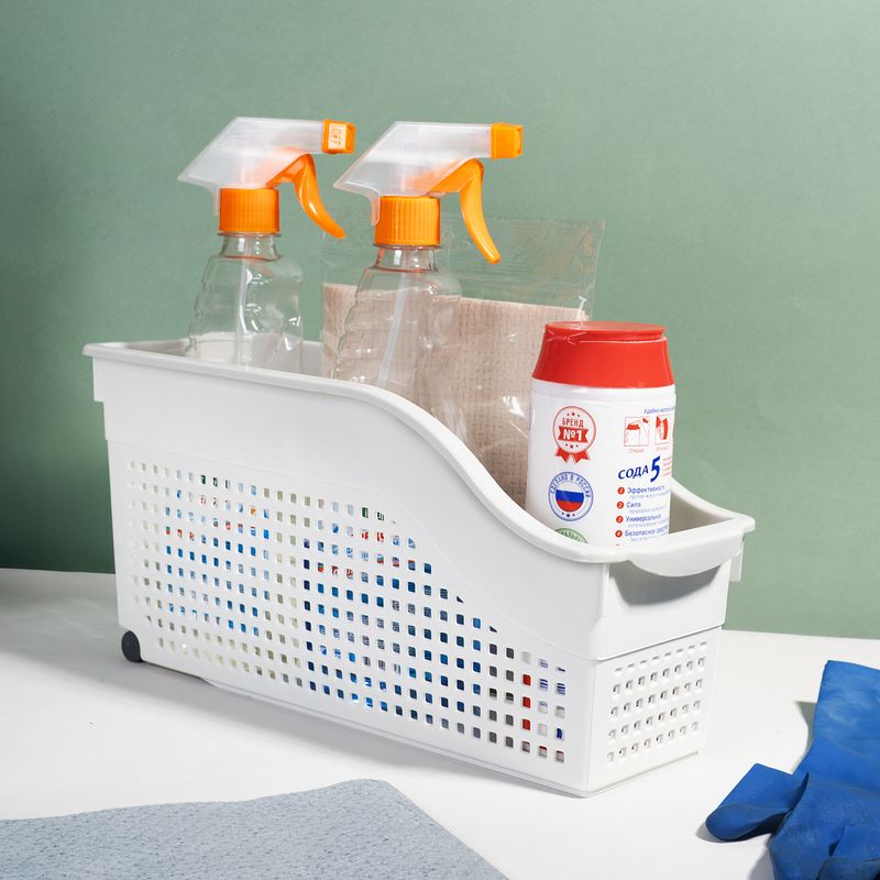 Контейнер на колёсиках – отличный вариант для организации хранения на кухне, в кладовке или ванной. Особенно удобен для использования в глубоких шкафах, благодаря колёсикам контейнер выезжает вперёд. Состав: полипропилен. Товар представлен в ассортименте.
