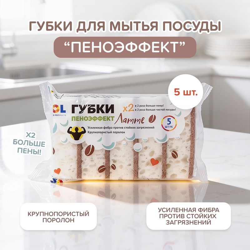 Губки для мытья посуды "Пеноэффект", SOL – незаменимая вещь в хозяйстве! Крупозернистый поролон способствует образованию обильной пены, что позволяет экономить моющее средство. Усиленная фибра отлично подходит для борьбы со стойкими загрязнениями. Оригинальные "кофейные" оттенки. В упаковке 5 губок. Состав: поролон, абразивный материал. Товар представлен в ассортименте.