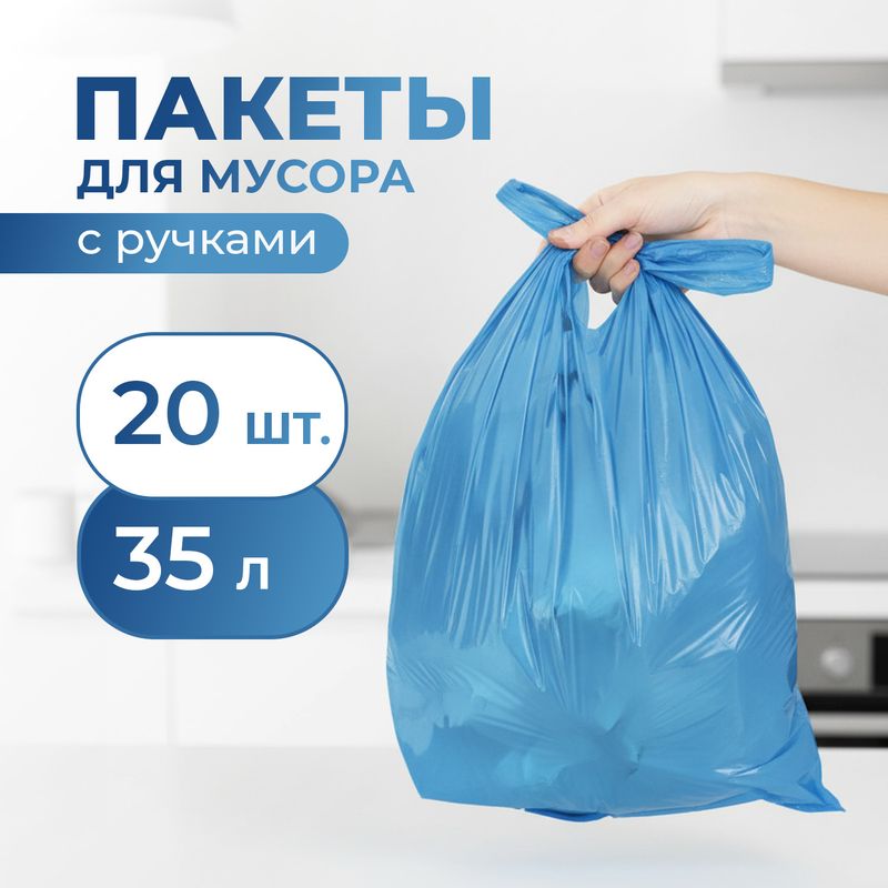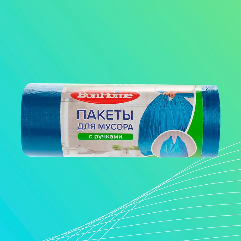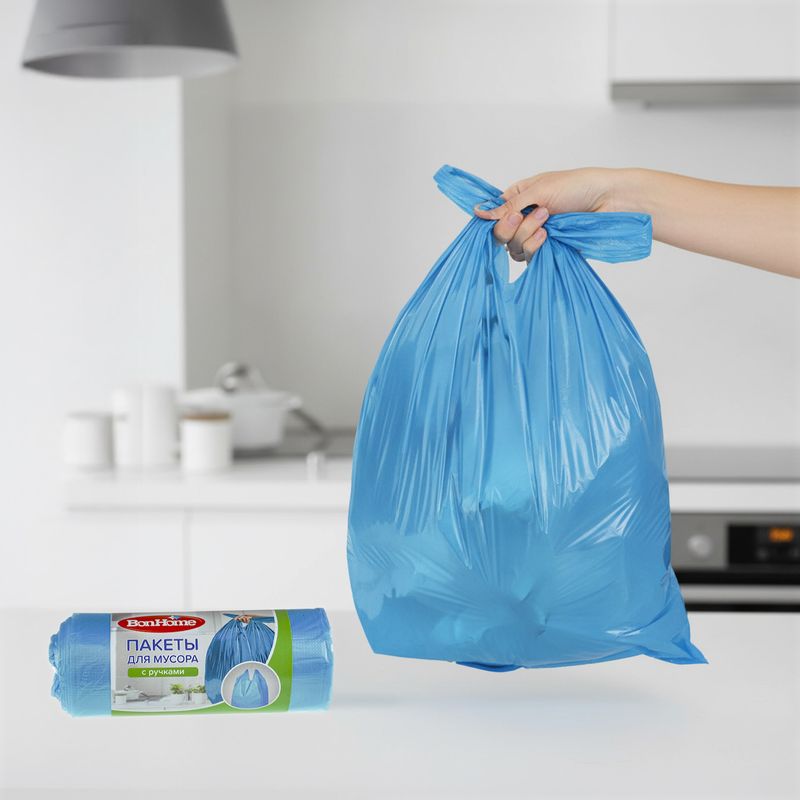 Пакеты для мусора, BonHome, с ручками – удобный выбор для утилизации бытовых отходов. В рулоне 20 пакетов объёмом 35 л. Состав: полиэтилен низкого давления, краситель.