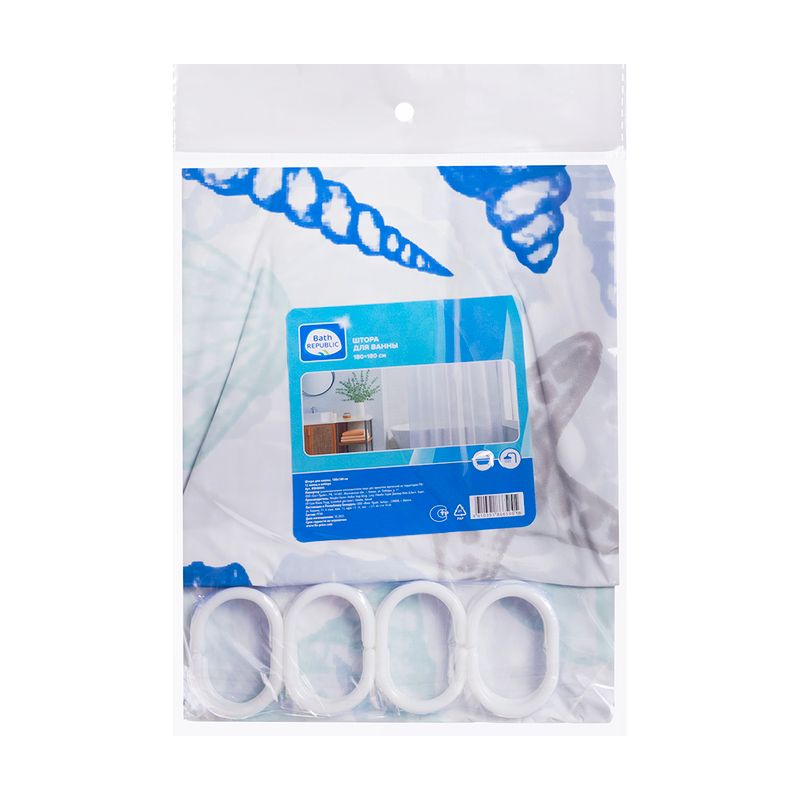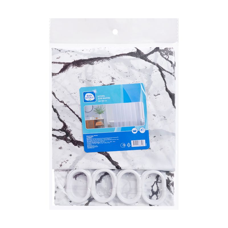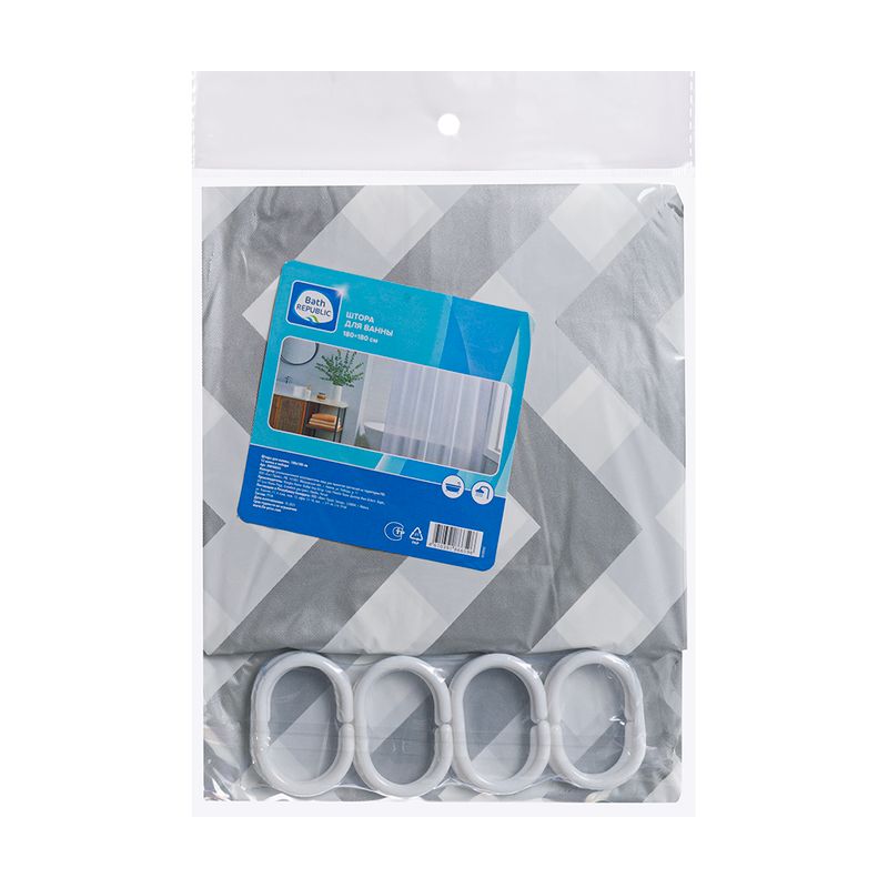 Штора для ванной, Bath Republic, защитит помещение от брызг и поможет поддерживать чистоту. Подходит для ванны и душевой. В комплект входят 12 колец. Размер: 180х180 см. Состав: PEVA. Товар представлен в ассортименте.