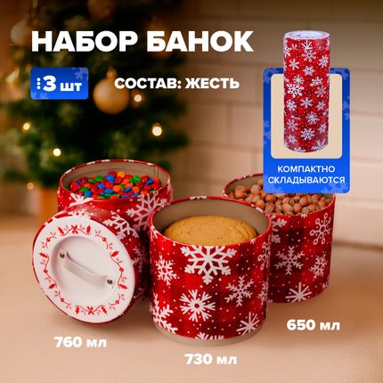 Арт. 5036757Набор банок, O'Kitchen, в новогоднем дизайне поможет создать праздничное настроение на кухне! В наборе 3 банки с крышками. Они отлично подходят для сыпучих продуктов и компактно складываются друг на друга. Объём: 650 мл, 730 мл, 760 мл. Состав: жесть. Товар представлен в ассортименте.