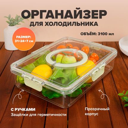 Арт. 5036797Органайзер для холодильника с ручками, O'Kitchen, поможет удобно разместить продукты и поддерживать порядок. Прозрачные стенки позволяют видеть содержимое, а ручки — легко выдвигать контейнер. Размер: 31х24х7 см. Объём: 3100 мл. Состав: ПЭТФ, полипропилен, силикон. Тепло свежей выпечки и краски весны в коллекции товаров для кухни «Аромат дома»!