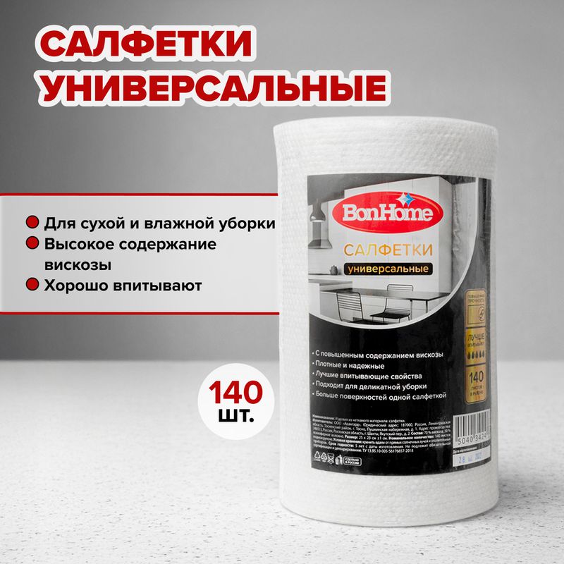 Салфетки "Универсальные", BonHome, подходят для уборки любых поверхностей. Повышенная впитываемость и прочность. В рулоне 140 салфеток размером 25х23 см. Состав: 70% вискоза, 30% полиэфирное волокно.