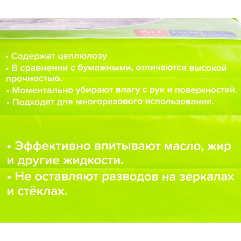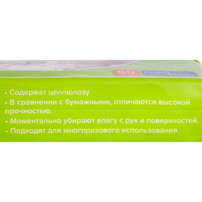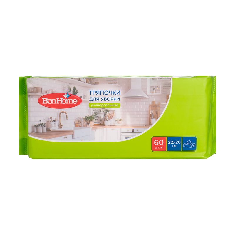 Тряпочки для уборки, BonHome – выгодная и практичная замена бумажных салфеток! Отличаются более высокой прочностью и подходят для многоразового использования. Моментально убирают влагу с рук и поверхностей. Эффективно впитывают масло, жир и другие жидкости. Не оставляют разводов на зеркалах и стёклах. Удобная упаковка. Внутри 60 тряпочек размером 22х20 см. Состав: 80% целлюлоза, 20% полипропилен.