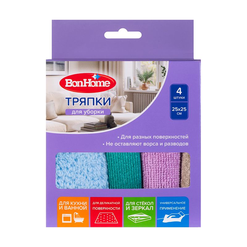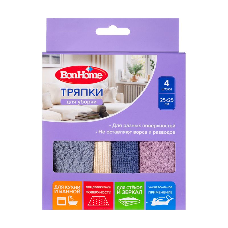 Тряпки для уборки, BonHome, разной текстуры подходят для кухни и ванной, стекла и зеркал, а также деликатных поверхностей. Отлично справляются с повседневной уборкой и не оставляют ворса и разводов. В комплекте 4 тряпки размером 25х25 см. Состав: 80% полиэстер, 20% полиамид. Товар представлен в ассортименте.