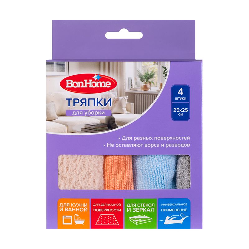 Тряпки для уборки, BonHome, 25х25 см, 4 шт., в ассортименте