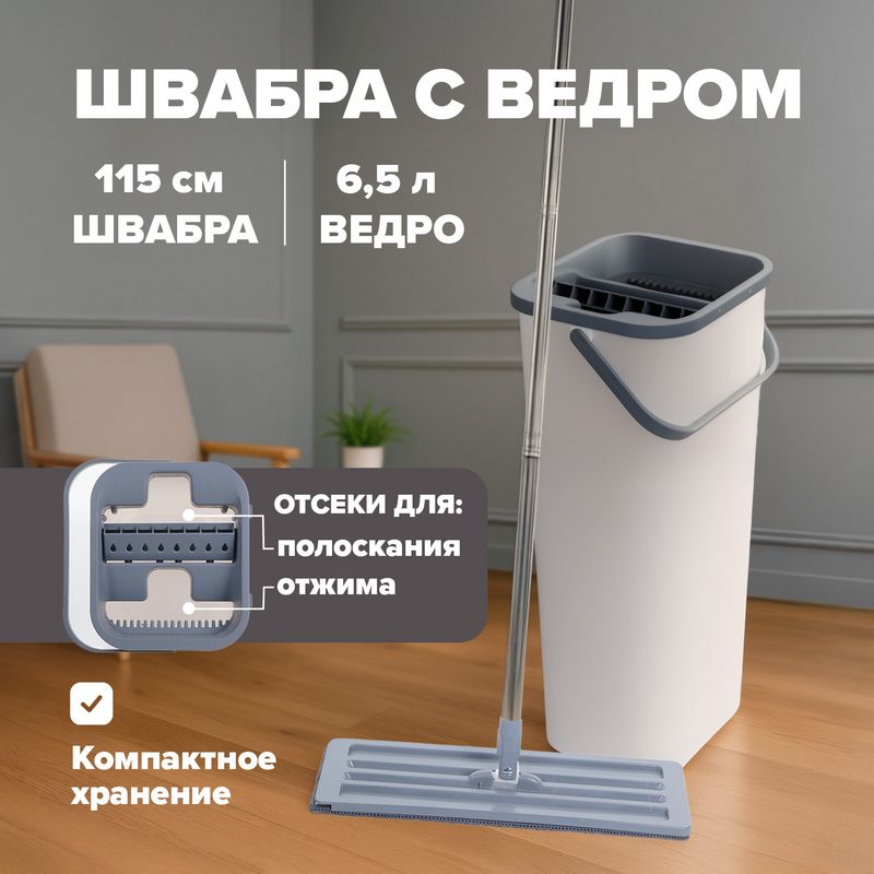 Швабра с ведром, Home Time, обеспечат быстрое и лёгкое мытьё полов. Отлично очищают от грязи и волос. Ведро оснащено отсеками для полоскания и отжима. В наборе: ручка швабры из 3 секций, 2 насадки из микрофибры, платформа для насадок, ведро и крышка. Длина швабры в собранном виде: 115 см. Объём ведра: 6,5 л. Подходит для компактного хранения. Перед использованием ознакомьтесь с инструкцией на упаковке. Состав: полипропилен, полиэстер, поролон, нержавеющая сталь.
