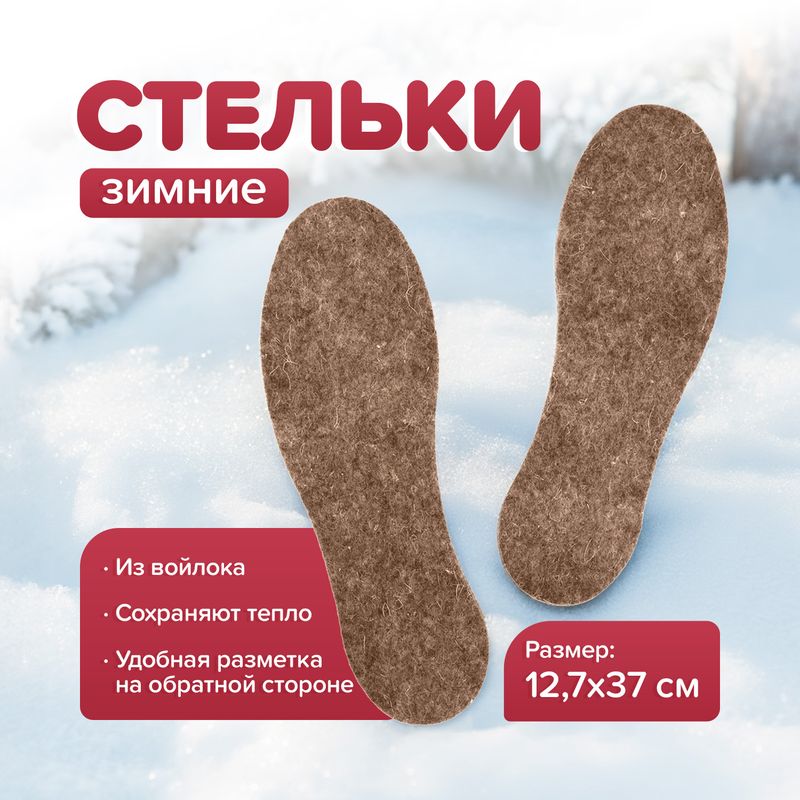 Зимние стельки, ТМ ПИК, из войлока обеспечат ежедневный комфорт и тепло при ношении. Войлок способствует улучшению теплообмена внутри обуви и обладает способностью поглощать влагу, что снижает вероятность переохлаждения стопы. Алюминиевая фольга обладает высокими теплоизоляционными свойствами и отражающей способностью, что обеспечивает длительное сохранение тепла. Благодаря удобной разметке на обратной стороне Вы сможете вырезать тот размер стелек, который Вам необходим. Размер стельки: 12,7х37 см. Состав: войлок натуральный, войлок искусственный, металлизированный лавсан.
