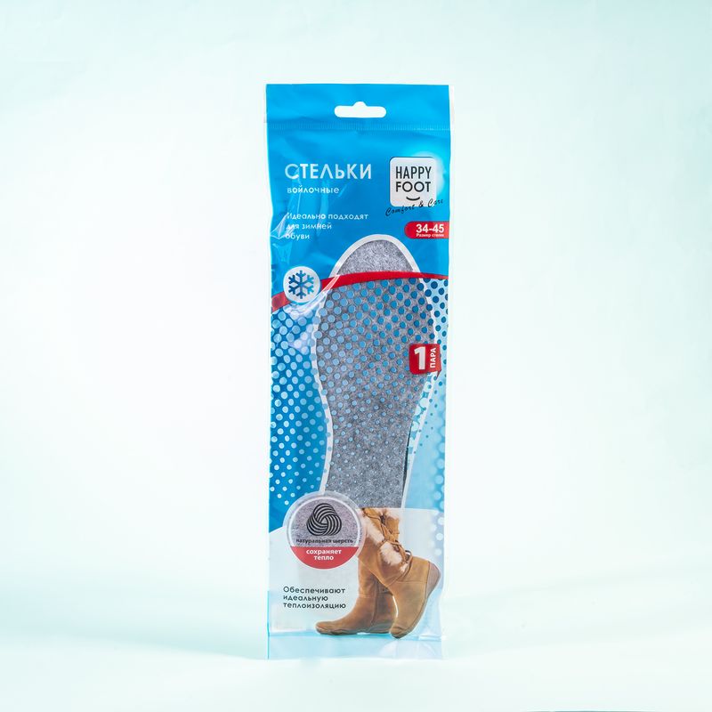 Стельки войлочные, Happy Foot, с натуральной шерстью сохранят тепло Ваших ног в холодное время года. Верхний слой изготовлен из прочного войлока, нижний слой на основе латекса. Можно вырезать стельки необходимого размера. В упаковке 1 пара.