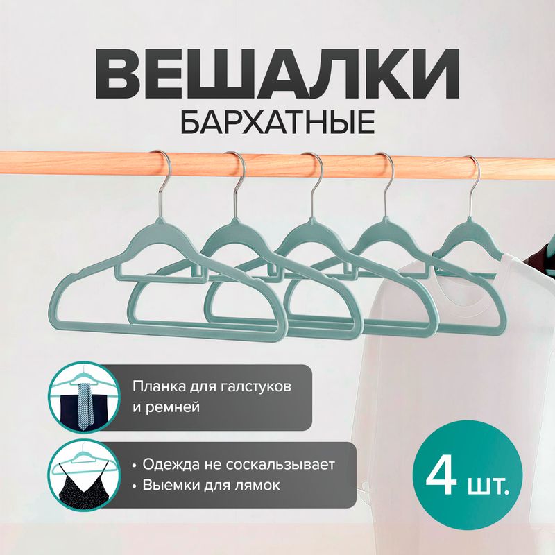 Вешалки бархатные, Home Time, с мягким покрытием препятствуют соскальзыванию одежды. Углубления на вешалках удобно использовать для лямок и бретелек сарафанов или топов. В наборе 4 вешалки. Материал: пластик АБС, нейлон, нержавеющая сталь. Товар представлен в ассортименте.