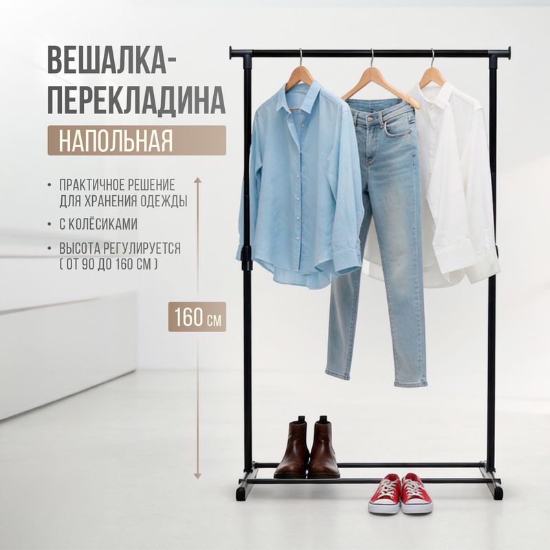Вешалка-перекладина напольная, Home time — функциональный вариант для хранения одежды в любом помещении. Регулируется по высоте от 90 до 160 см, подходит для детских и взрослых вещей, оснащена колёсиками для удобного перемещения и занимает минимум места. Высота: до 160 см. Состав: полипропилен, углеродистая сталь.