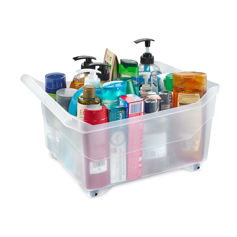 Контейнер с колёсами подходит для использования на кухне, в шкафу или в ванной комнате. В нём удобно хранить бытовую химию, аксессуары для кухни и уборки. Контейнер с ручками и колёсами легко передвигать. Приблизительный размер: 40х30х22 см. Состав: полипропилен.
